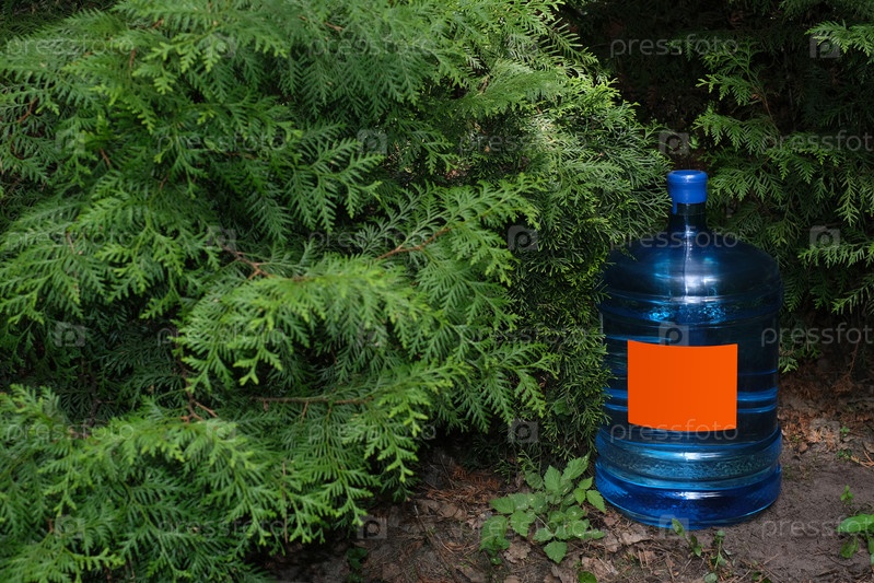 Большая синяя бутылка для воды на фоне зеленого леса. Дизайн упаковки