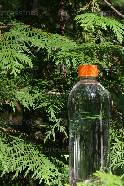 Бутылка для воды на фоне зеленого леса. Дизайн упаковки