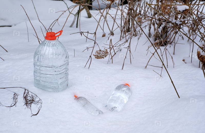 Бутылки с питьевой водой на снегу. рекламный плакат