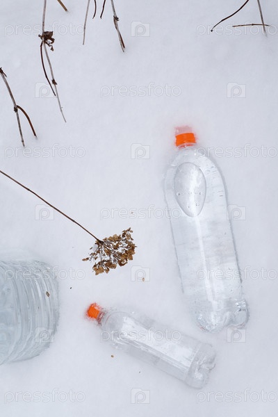Бутылки с питьевой водой на снегу. рекламный плакат