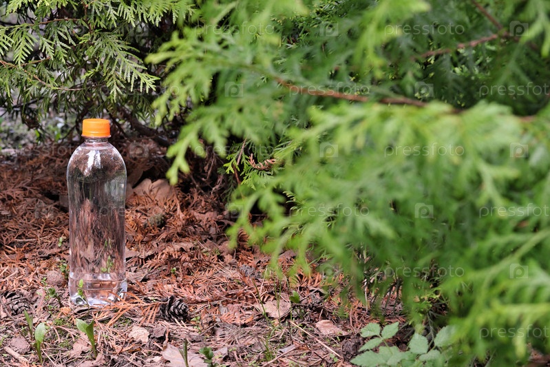 Маленькая бутылочка для воды на фоне зеленого леса. Дизайн упаковки
