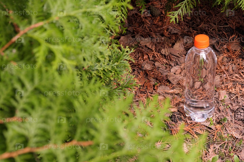 Маленькая бутылочка для воды на фоне зеленого леса. Дизайн упаковки