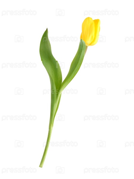 Одиночный, яркий желтый тюльпан с сочными зелеными листьями представлен изолированно на простом белом фоне