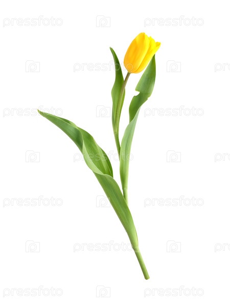 Одиночный, яркий желтый тюльпан с сочными зелеными листьями представлен изолированно на простом белом фоне