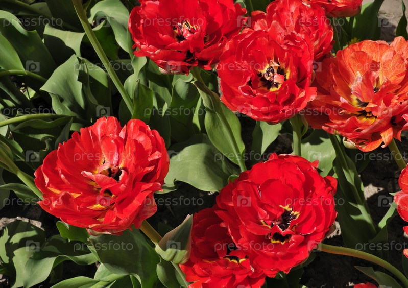 Цветущие красные тюльпаны. Естественный изолированный фон в ботаническом саду