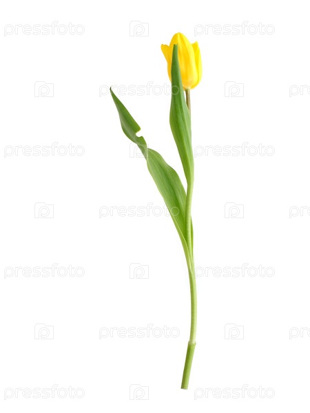 Одиночный, яркий желтый тюльпан с сочными зелеными листьями представлен изолированно на простом белом фоне