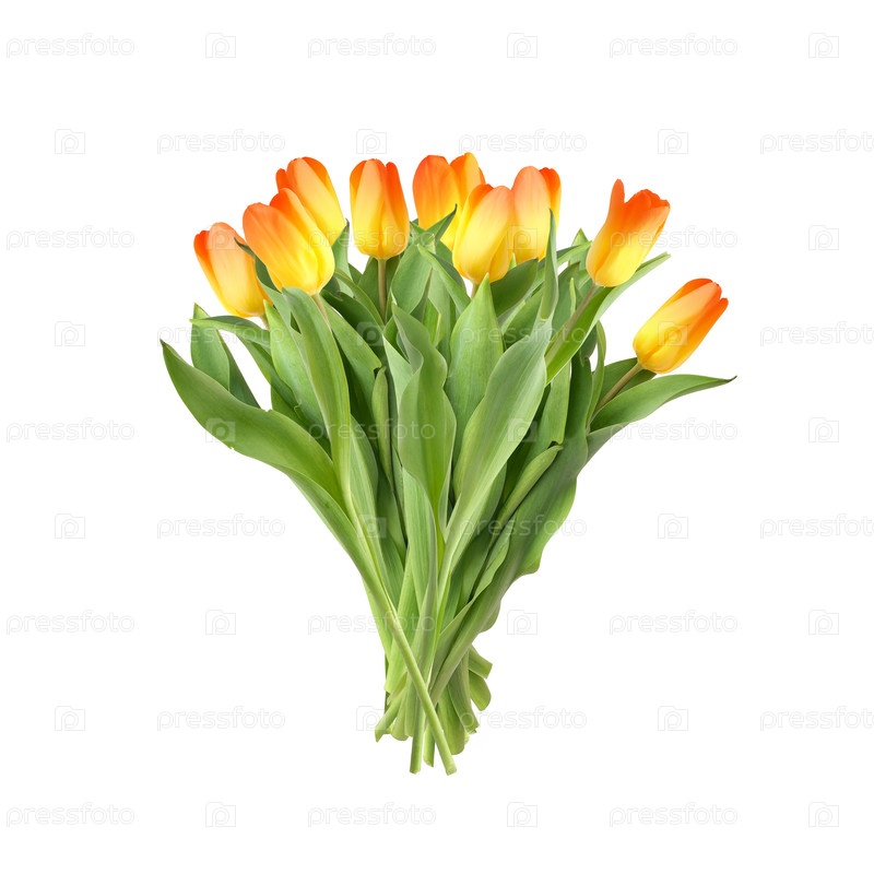 Три ярких желтых тюльпана с сочными зелеными листьями представлены изолированно на простом белом фоне