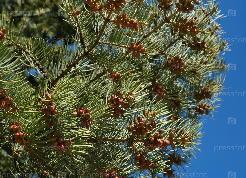 Сосна однохвойная. Зеленые ветви хвойного дерева на фоне голубого неба. Изолированный фон