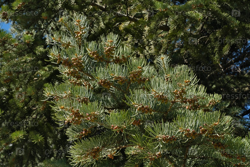 Зеленые ветви хвойного дерева на фоне голубого неба. Изолированный фон
