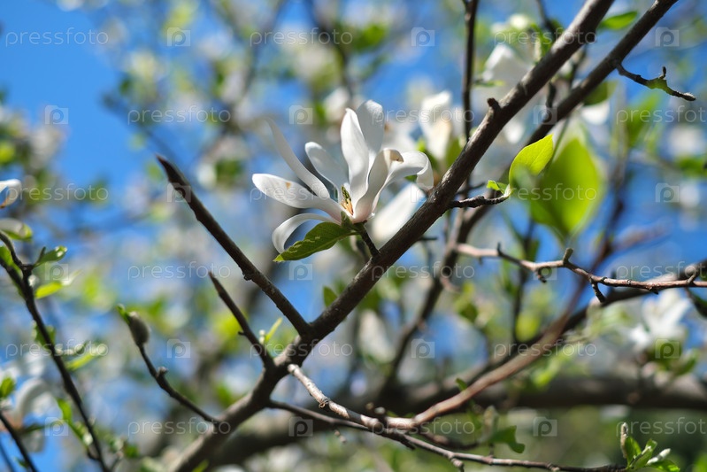 Цветущая белая магнолия на фоне голубого неба