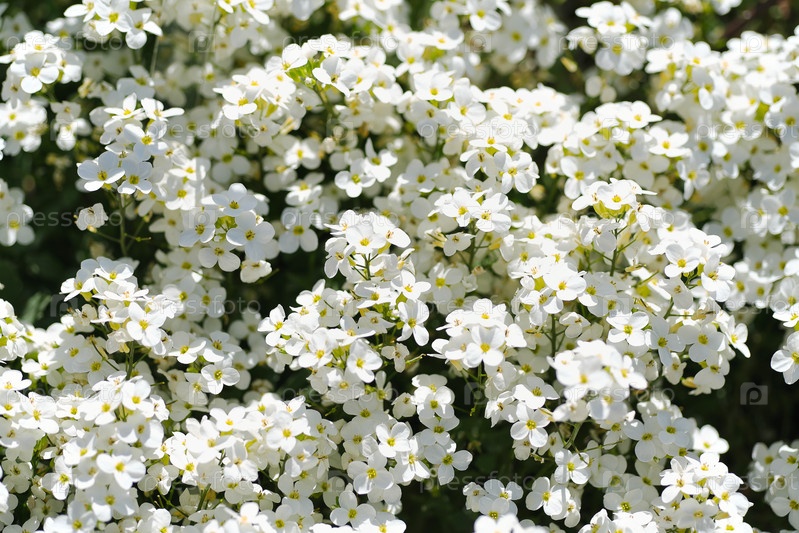 Цветущий белый Arabis alpina. Естественный изолированный фон в ботаническом саду