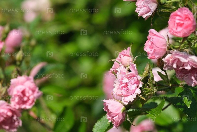 Кустовые розы исторического сорта. Естественный изолированный фон в ботаническом саду