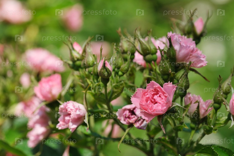 Кустовые розы исторического сорта. Естественный изолированный фон в ботаническом саду