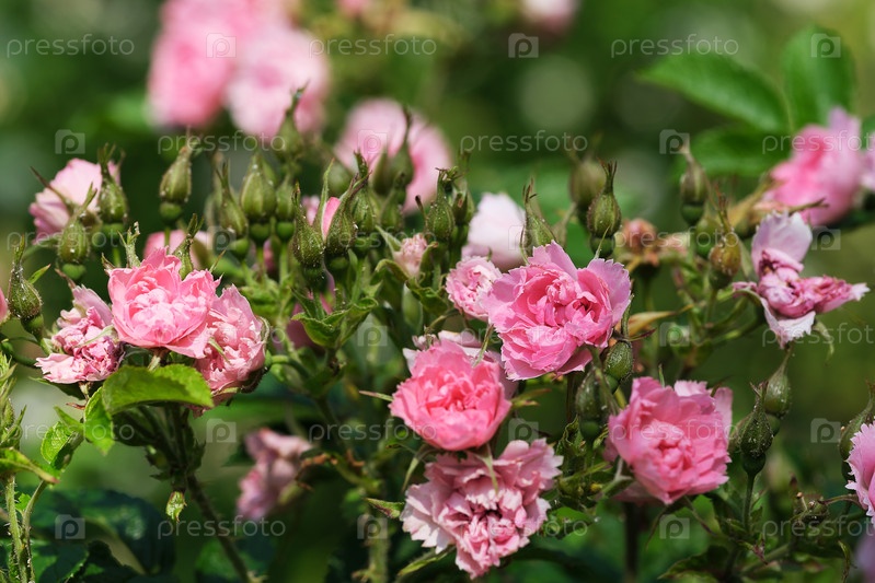 Кустовые розы исторического сорта. Естественный изолированный фон в ботаническом саду