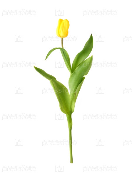 Одиночный, яркий желтый тюльпан с сочными зелеными листьями представлен изолированно на простом белом фоне