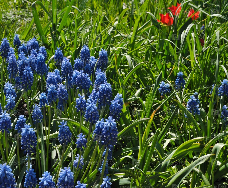 Цветущий синий мускари (виноградный гиацинт) в зеленой траве (изолированный фон)