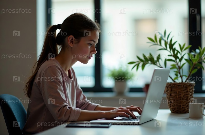 Женщина-работница Работа на ноутбуке в офисе, удаленная работа на ноутбуке. Генеративный искусственный интеллект