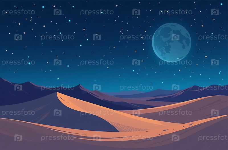 Песчаные дюны в лунном свете, пустынные красные холмы в ночном небе. Генеративный ИИ