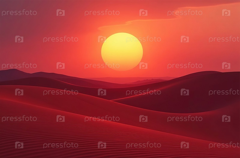 Песчаные дюны в солнечном свете, пустынные красные холмы пустыни на закатном небе. Генеративный искусственный интеллект