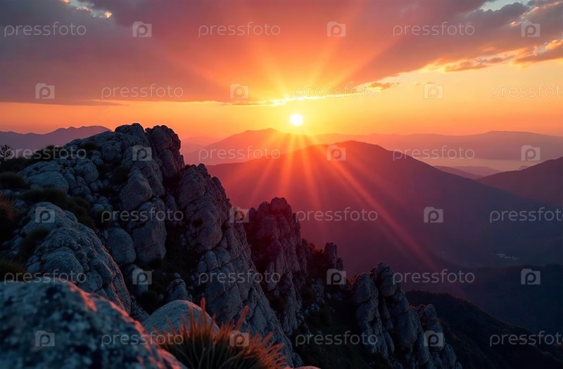 Горный пейзаж, лучи закатного солнца на заднем плане, природа восхода солнца. Генеративный искусственный интеллект
