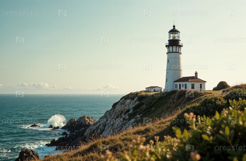 Маяк в океане, морской пейзаж, волны, голубое небо, каменный мыс, вода. Генеративный ИИ