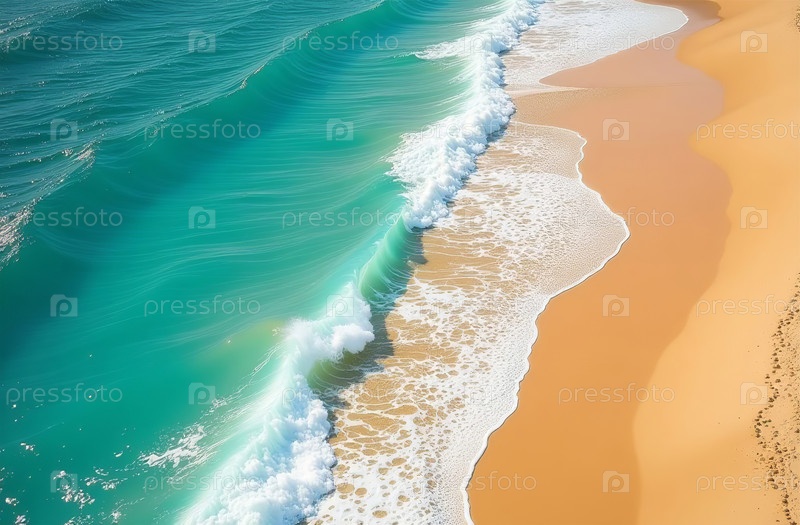 Голубая океанская волна, белая морская пена, морской пейзаж, пустынный песчаный пляж. Генеративный ИИ