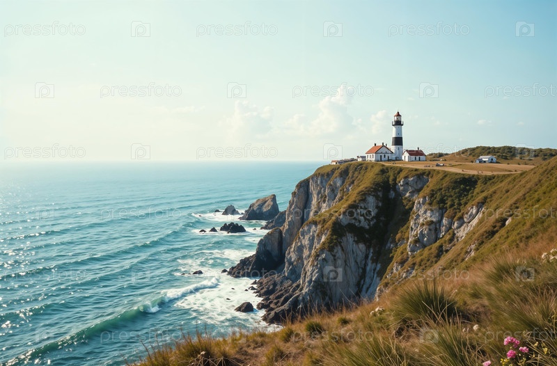 Маяк в океане, морской пейзаж, волны, голубое небо, каменный мыс, вода. Генеративный ИИ