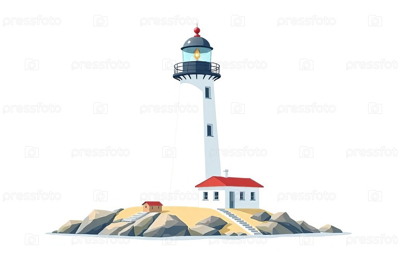 Иллюстрация Маяк в океане, морской пейзаж, каменный мыс, вода. Генеративный ИИ