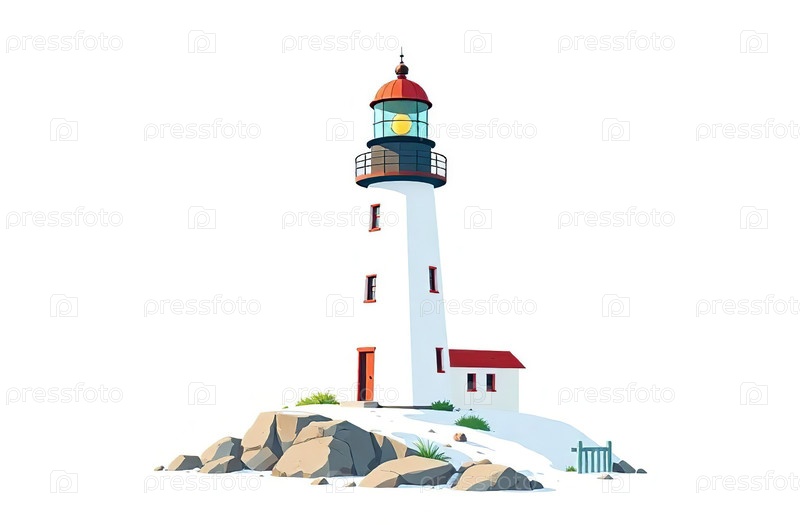 Иллюстрация Маяк в океане, морской пейзаж, каменный мыс, вода. Генеративный ИИ