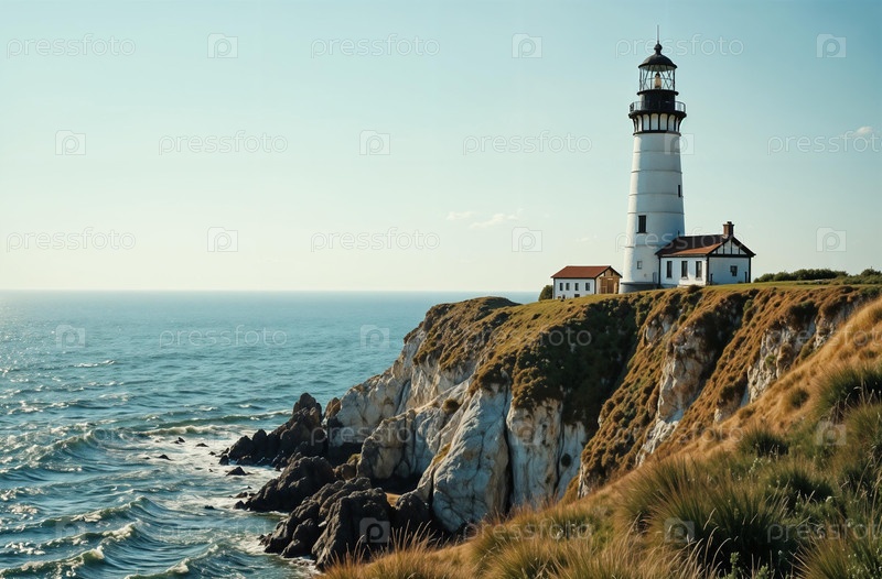 Маяк в океане, морской пейзаж, волны, голубое небо, каменный мыс, вода. Генеративный ИИ