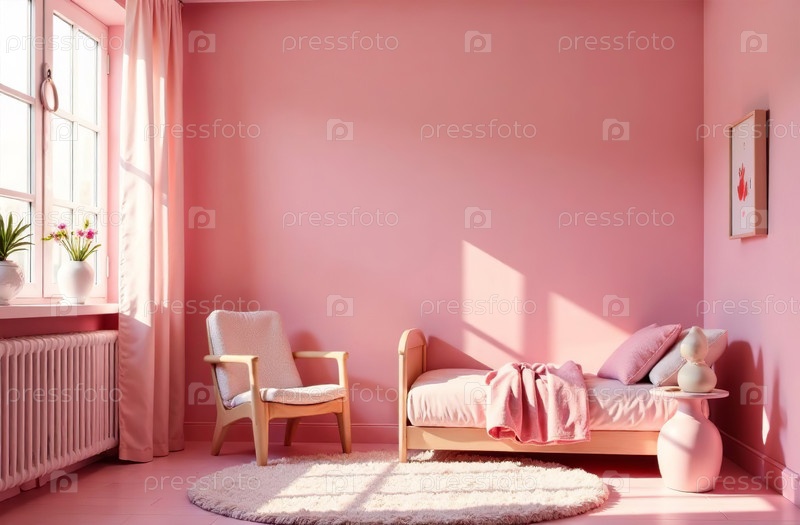 Современный интерьер детской комнаты розового цвета, игровая комната в доме. Генеративный искусственный интеллект
