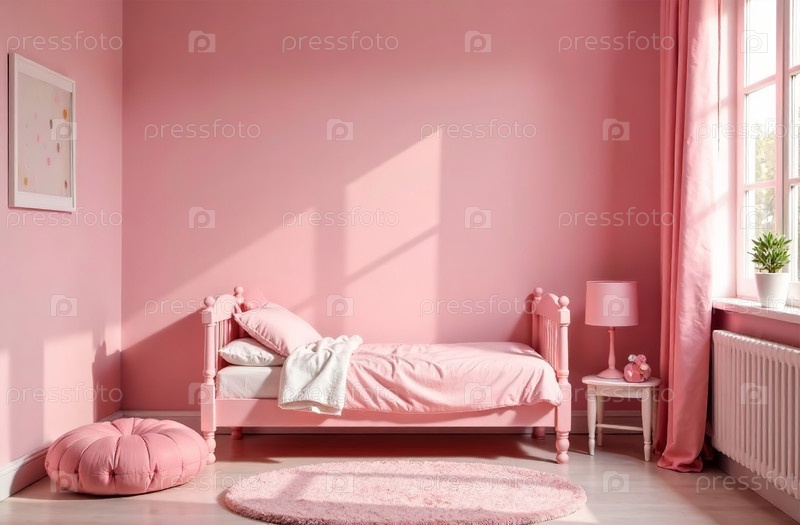 Современный интерьер детской комнаты розового цвета, игровая комната в доме. Генеративный искусственный интеллект