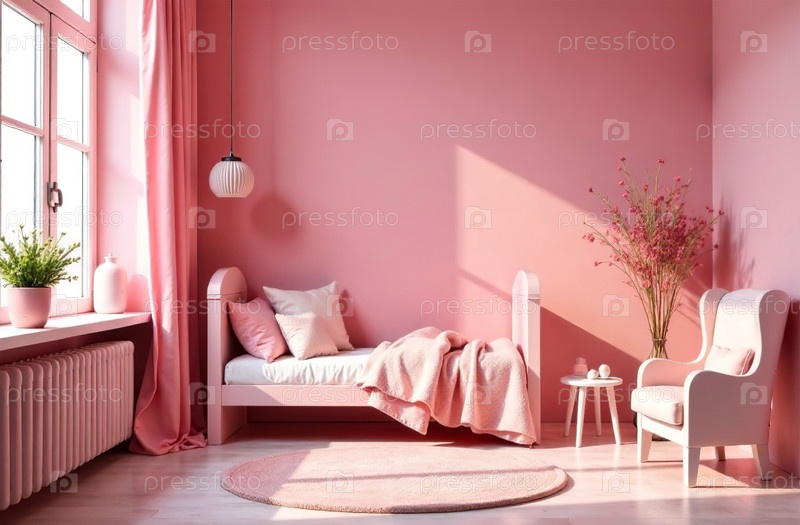Современный интерьер детской комнаты розового цвета, игровая комната в доме. Генеративный искусственный интеллект