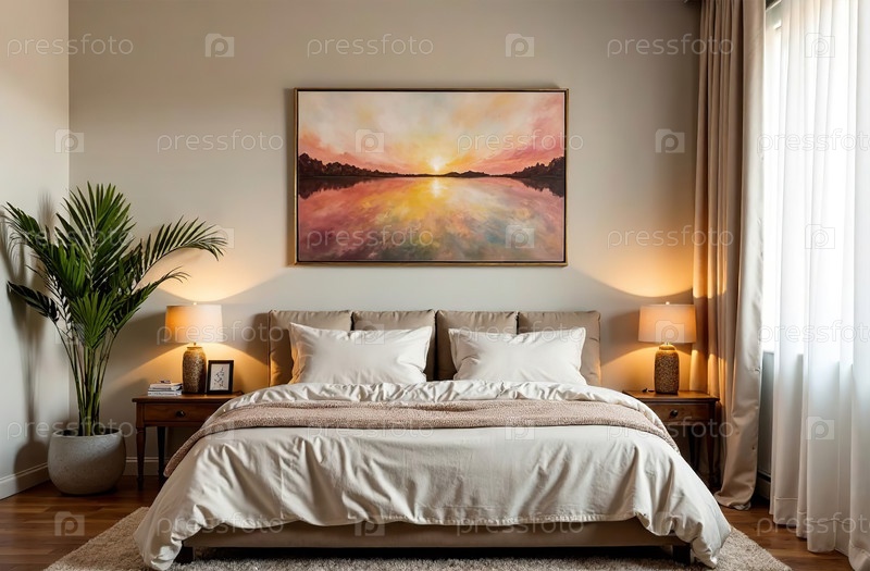 Современный уютный интерьер спальни, комфортный дизайн дома. Генеративный искусственный интеллект