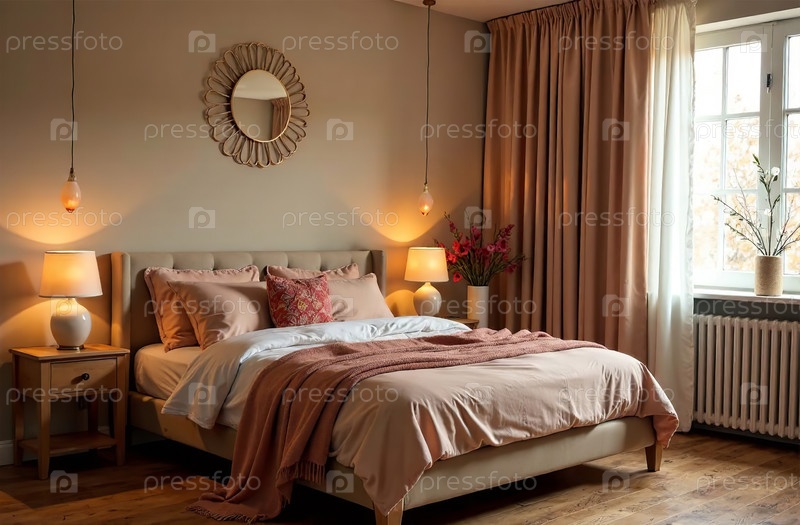 Современный уютный интерьер спальни, комфортный дизайн дома. Генеративный искусственный интеллект