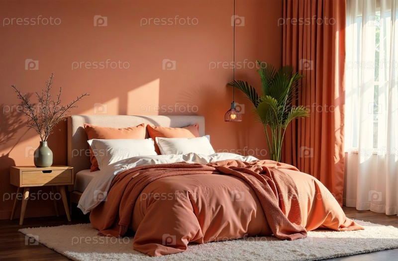Современный розовый интерьер спальни квартиры, комфортный дизайн дома. Генеративный искусственный интеллект