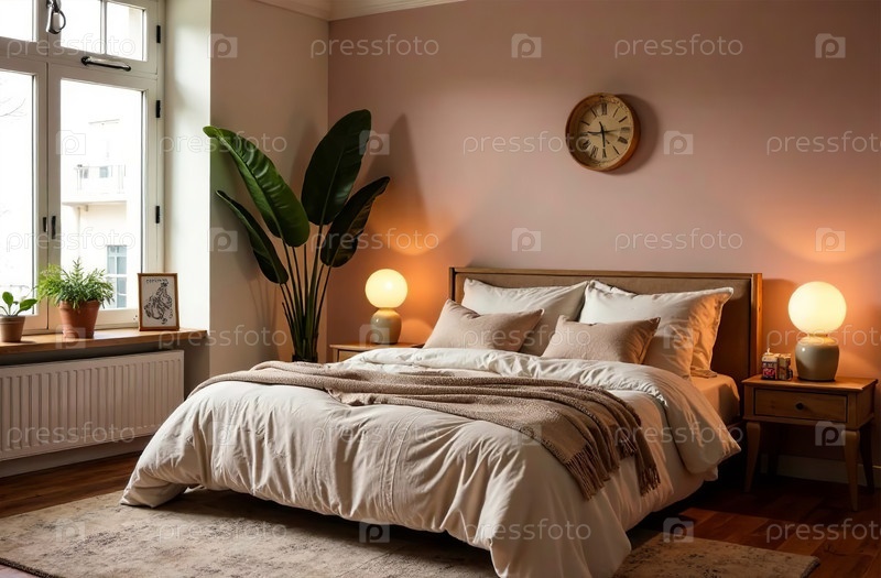 Современный уютный интерьер спальни, комфортный дизайн дома. Генеративный искусственный интеллект