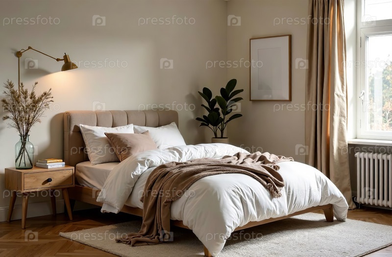 Современный уютный интерьер спальни, комфортный дизайн дома. Генеративный искусственный интеллект