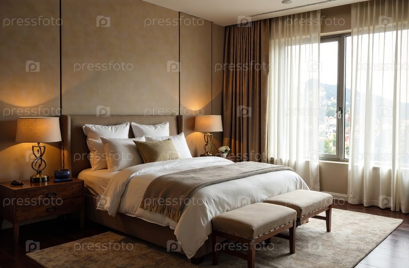 Современный уютный интерьер спальни, комфортный дизайн дома. Генеративный искусственный интеллект