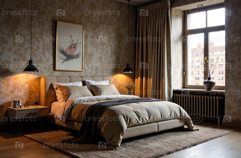 Современный уютный интерьер спальни, комфортный дизайн дома. Генеративный искусственный интеллект