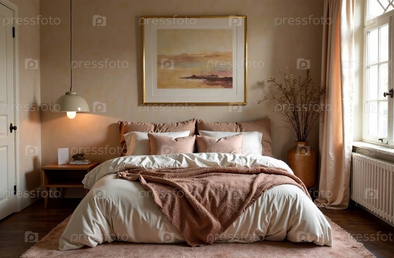Современный уютный интерьер спальни, комфортный дизайн дома. Генеративный искусственный интеллект