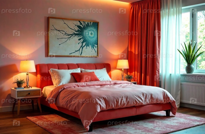 Современный розовый интерьер спальни квартиры, комфортный дизайн дома. Генеративный искусственный интеллект