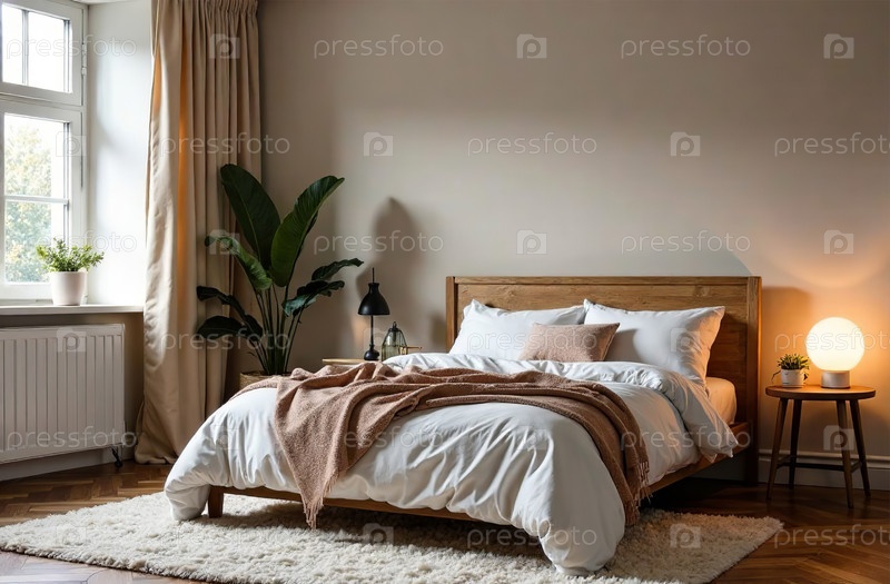 Современный уютный интерьер спальни, комфортный дизайн дома. Генеративный искусственный интеллект