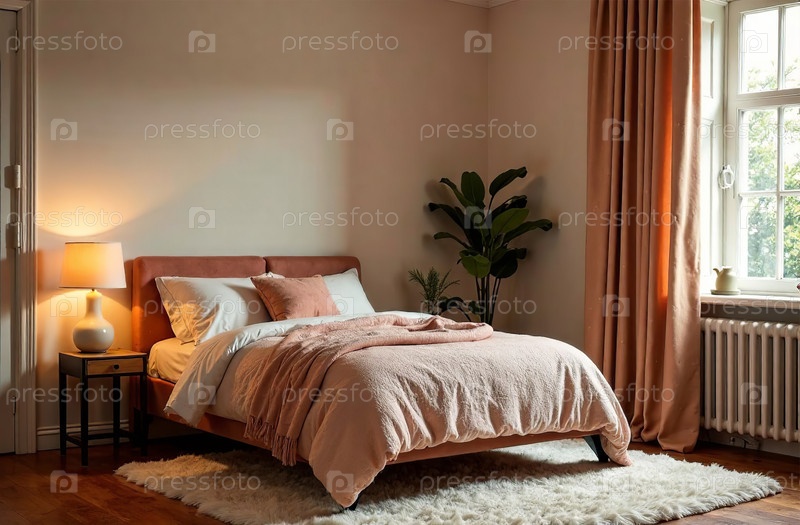 Современный уютный интерьер спальни, комфортный дизайн дома. Генеративный искусственный интеллект