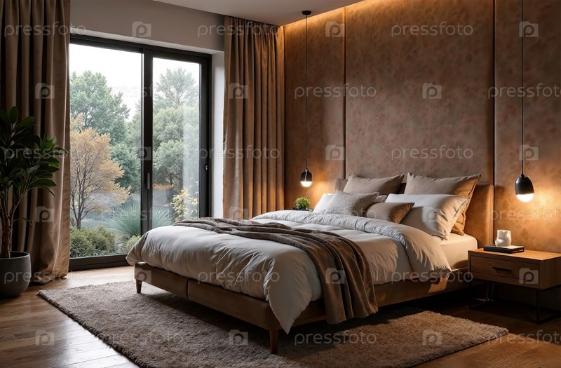 Современный уютный интерьер спальни, комфортный дизайн дома. Генеративный искусственный интеллект