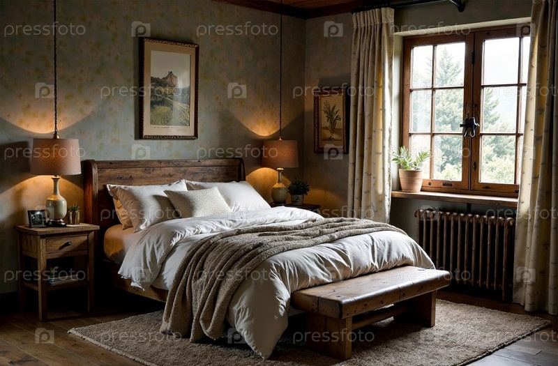 Современный уютный интерьер спальни, комфортный дизайн дома. Генеративный искусственный интеллект