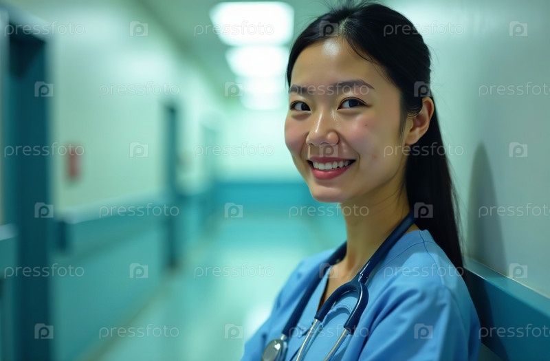 Портрет женщины-врача Фон коридора в больнице. Сгенерировано ИИ