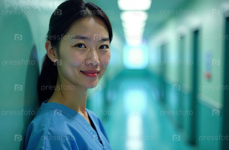 Портрет женщины-врача Фон коридора в больнице. Сгенерировано ИИ