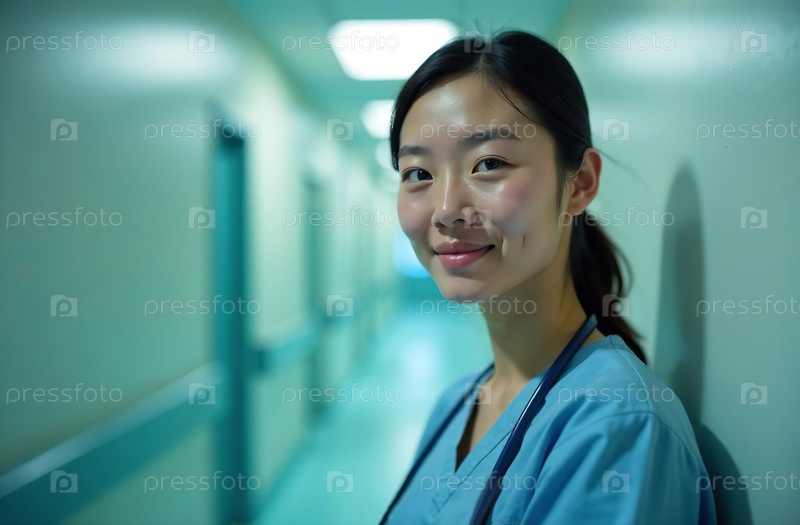 Портрет женщины-врача Фон коридора в больнице. Сгенерировано ИИ