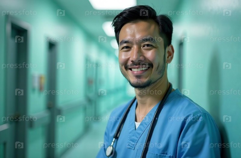 Портрет мужчины-врача Фон коридора в больнице. Сгенерировано искусственным интеллектом